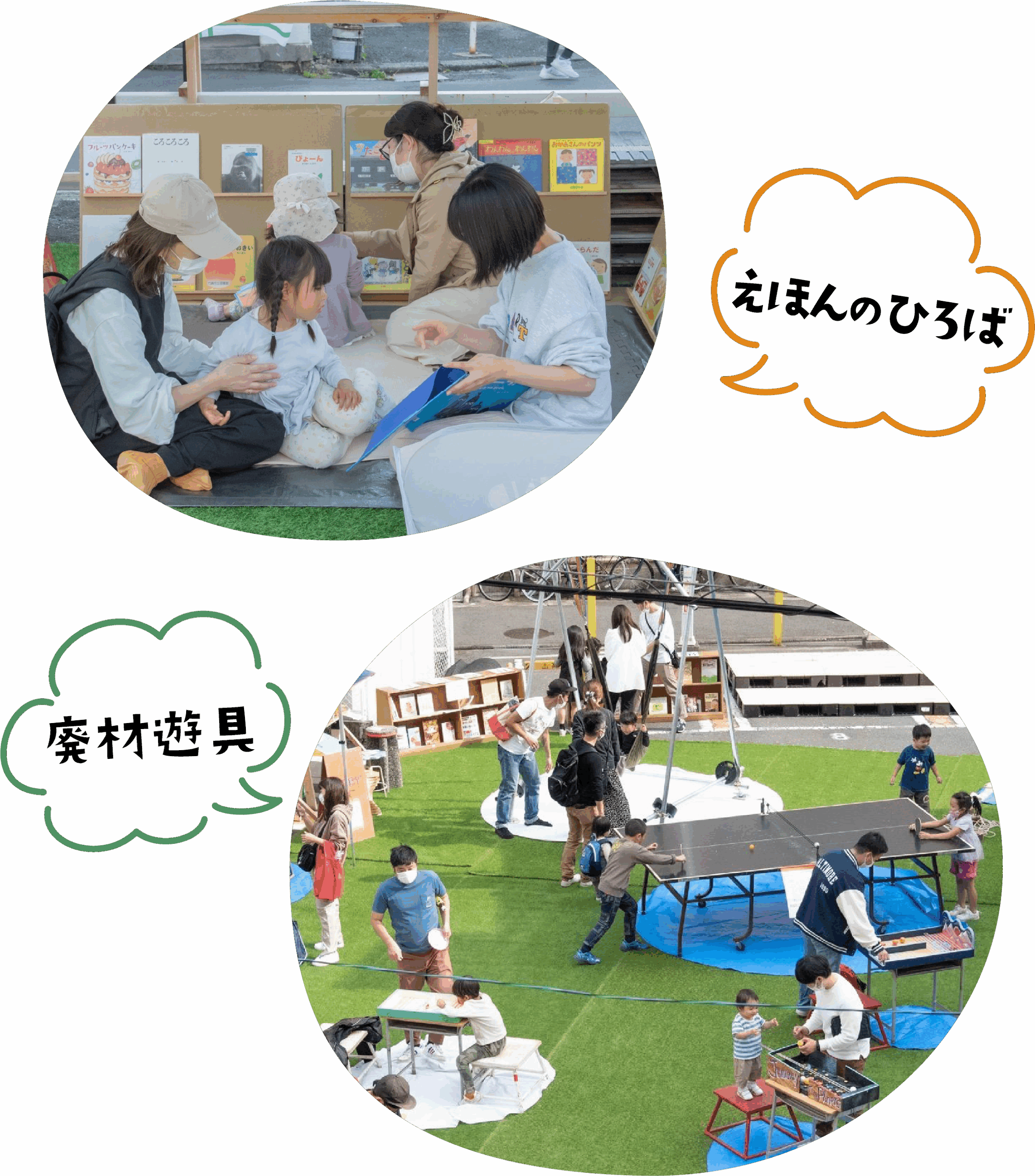 親子でゆったり楽しめる「ちびっこ広場」や、廃材で作られた遊具など