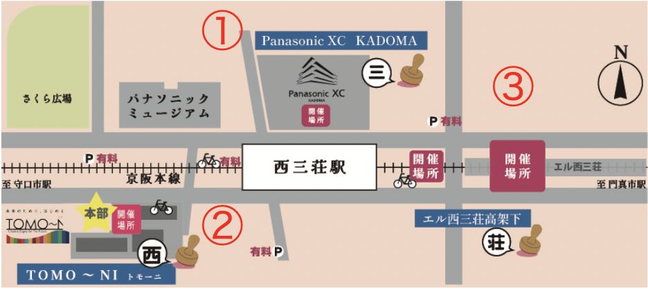 開催場所 | 1Panasonic XC KADOMA 2トモーニエリア(京阪西三荘スクエア) 3エル西三荘エリア-「ちびっこ広場」·駐輪場跡地 | 京阪本線高架下【最寄駅】西三荘駅